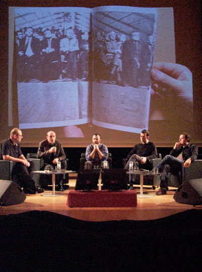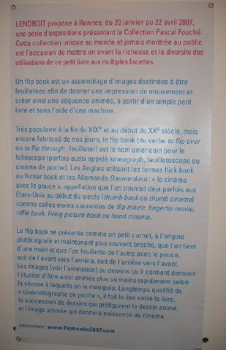 Rennes (suite)Quelques images de Rennes pour donner envie d’y aller…Les photos que j’avais montrées en rentrant de l'inauguration je les avais prises à Lendroit, là où sont exposés les flip books d’artistes. Le deuxième lieu d’exposition inauguré le 20 janvier était La Chapelle Saint Yves qui est l’Office du Tourisme de Rennes. C’est juste un aperçu en fait de ce qui sera exposé à l’Orangerie du Parc du Thabor à partir de samedi prochain. On y voit une centaine de flip books de tous les genres et le DVD est projeté sur grand écran (on l'aperçoit derrière). Les photos ont été prises par Mathieu Renard. Dernière manifestation à laquelle j’ai participé, le débat à la bibliothèque des Champs Libres, mercredi dernier. De gauche à droite on peut voir sur la photo (de Caroline Gautier) : Mathieu Renard, qui organise toutes ces manifestations, moi-même, Thomas Dupuis, auteur sous le pseudonyme d’Otto T. et qui dirige les éditions flblb, Claude Zurcher et Richard Charrier, les fondateurs d’Olga éditions. Outre la discussion que nous avons eue, le DVD était projeté sur l’écran derrière nous et on a pu voir un reportage passé sur la télévision suisse sur le travail d’Olga éditions et une vidéo de quelques flip books inédits de Thomas Dupuis. Quatre-vingts à cent personnes ont assisté à ce débat j'espère intéressant qui pouvait aussi être suivi sur le site internet de la manifestation (http://www.flipbooks2007.com/). 25 février 2007 à 20:45:16