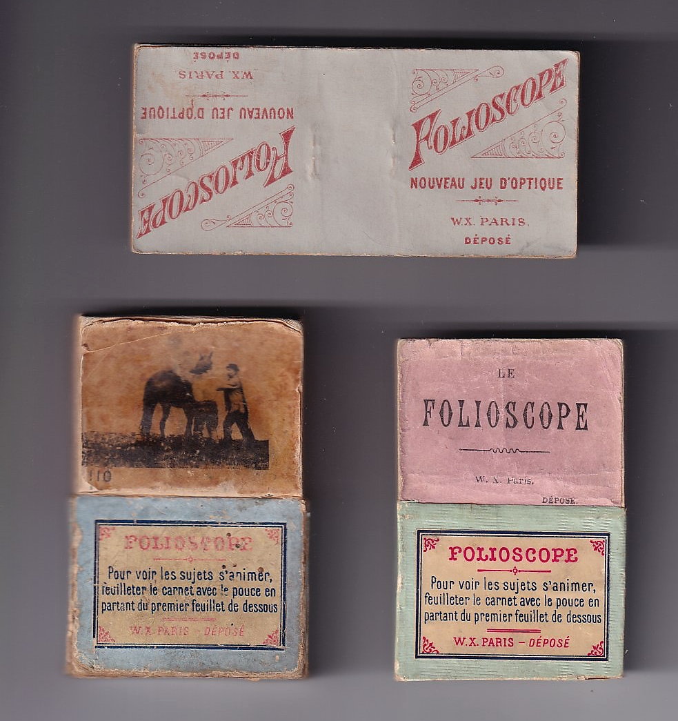 Depuis j’avais trouvé un autre flip book de Watilliaux (en bas à gauche), recto verso, contenant cette fois deux séquences photographiques, qui avait été restauré et dont il manquait les couvertures.